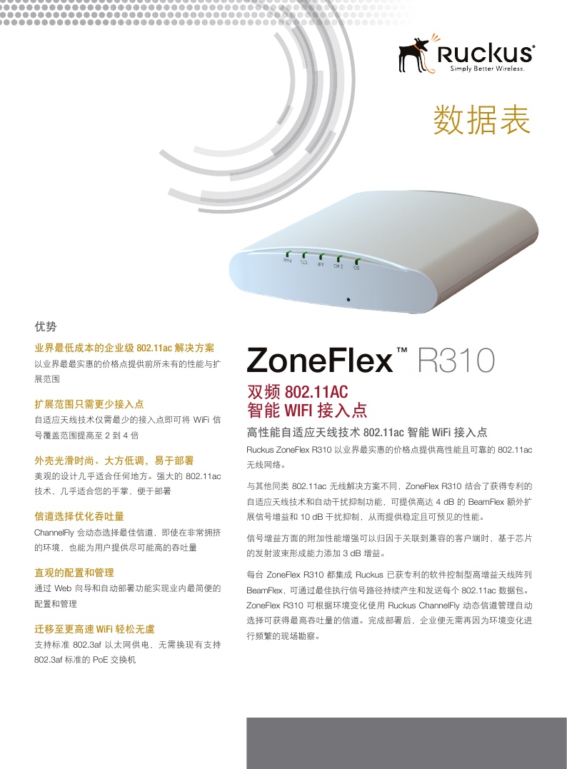 产品简单描述:901-R310-WW02 ZoneFlex R310 802.11ac 室内AP,支持2.4GHz和5GHz双载频,1x10/100/1000Mbps 以太网口,802.3af POE,2*2:2,BeamFlex 。不带12VDC电源和POE模块.