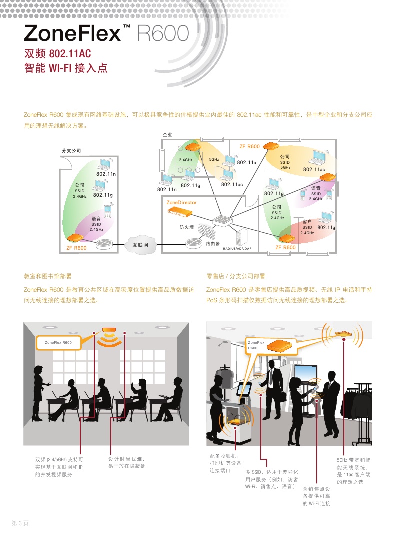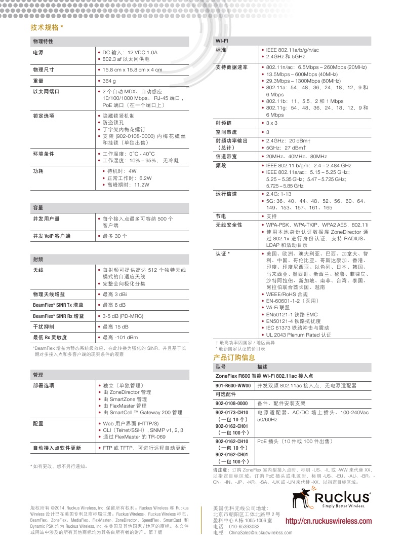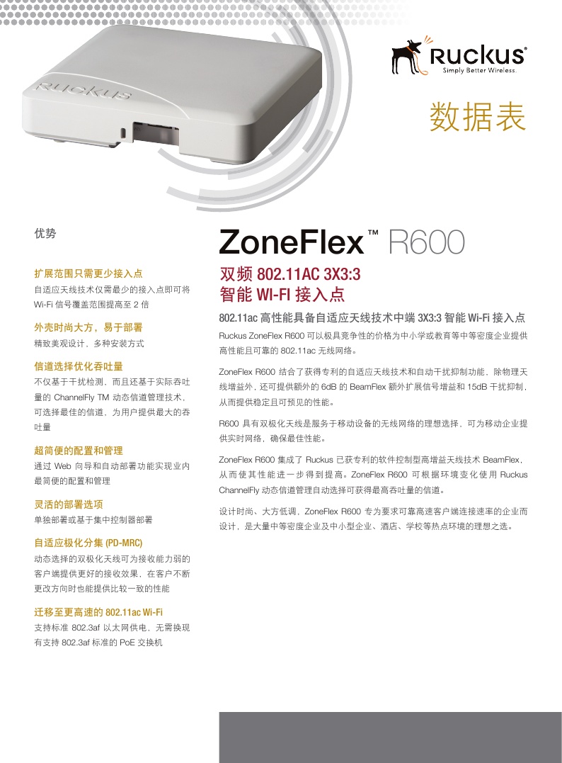 产品简单描述:901-R600-WW00 802.11AC 室内AP,支持2.4GHz和5GHz双载频,2x10/100/1000Mbps 以太网口,802.3af/at POE 供电输入和12VDC电源,3*3:3,1750Mbps(1300Mbps+450Mbps)。不带12VDC电源模块. 最多支持500用户